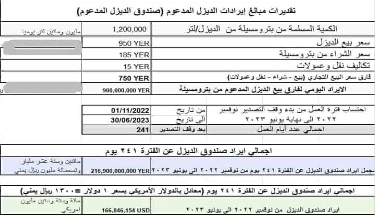 216مليار تم نهبها من جيوب المواطنين في حضرموت بحجة فرق سعر مادة الديزل المدعوم في مدة 241 يوم .. حيث أن تكلفته الفعلية 200 ريال للتر الواحد ويباع المواطن 950 أي 750 ريال زيادة في كل لتر يتجرعها المواطن دون وجه حق.