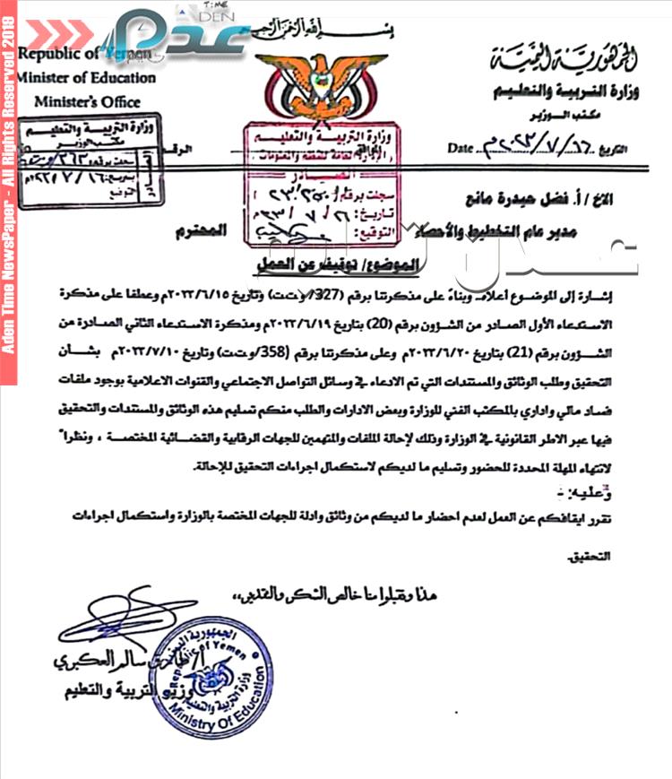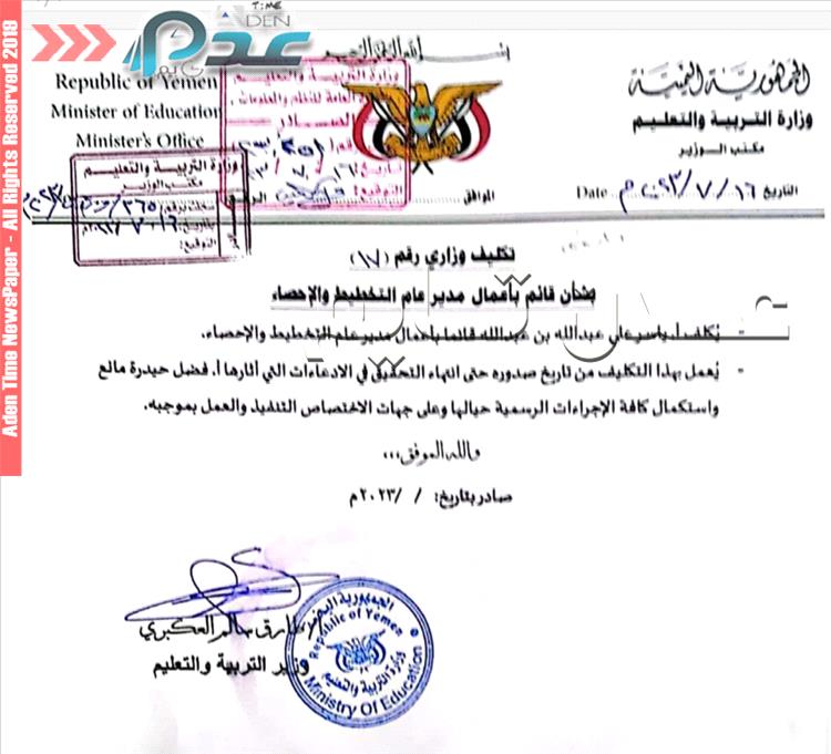 وزير التربية والتعليم يوقف مدير عام عن عمله ويكلف آخر بدلا عنه"وثائق"