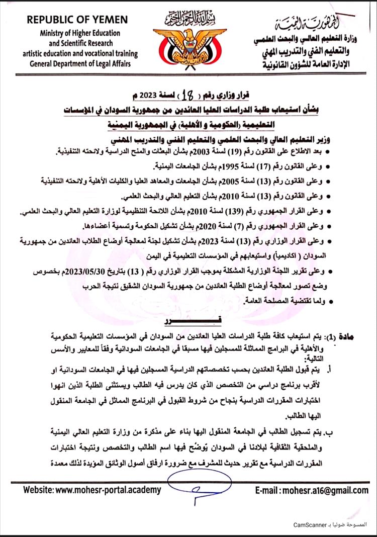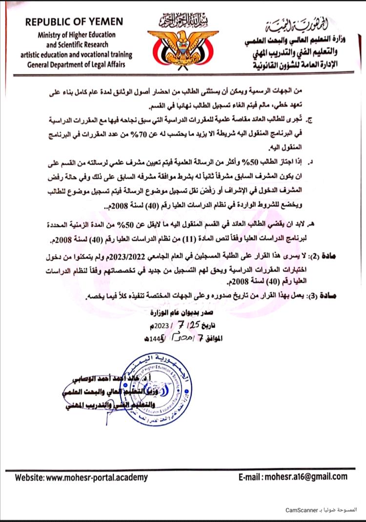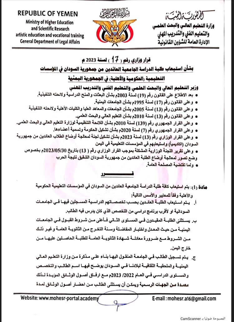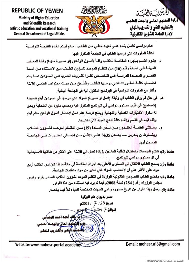 أصدر وزير التعليم العالي والبحث العلمي والتعليم الفني والتدريب المهني أ.د/ خالد أحمد الوصابي قرارين وزاريين رقم ١٧، ١٨ للعام ٢٠٢٣م، بشأن معالجة أوضاع الطلاب اليمنيين العائدين من جمهورية السودان.
