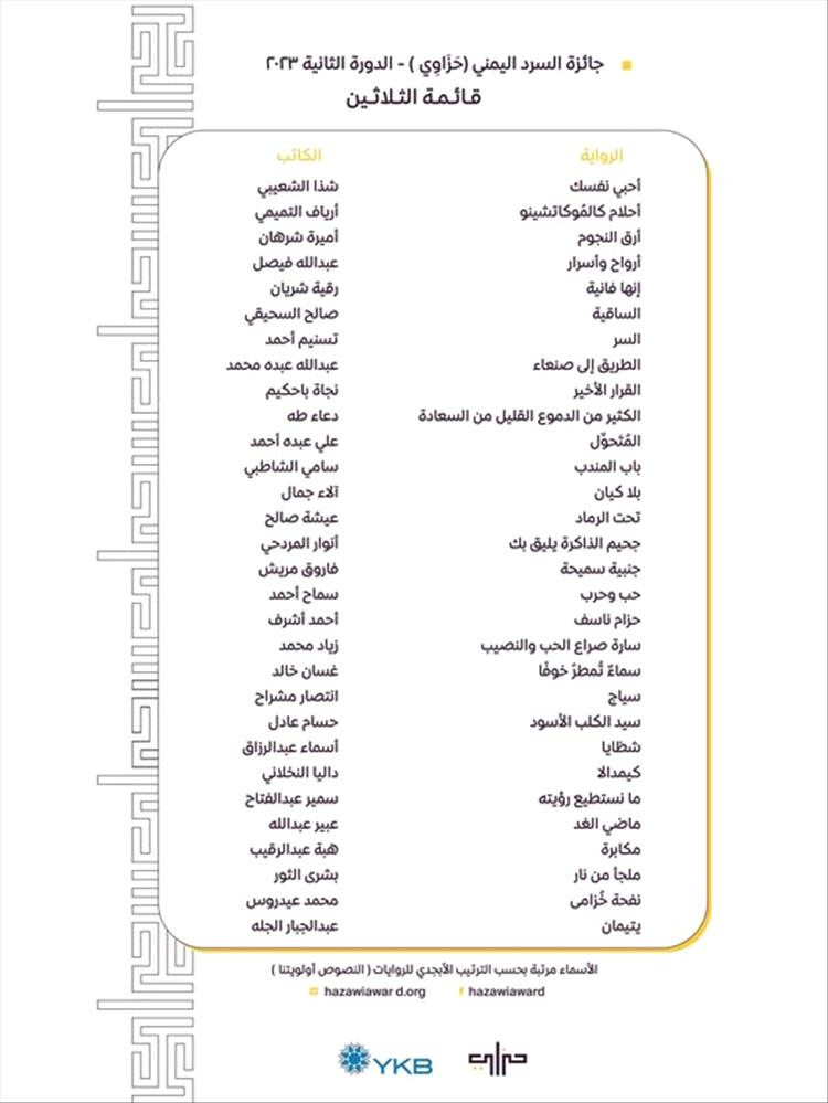 يُذكر أن جائزة السرد اليمني "حَزَاوي"، جائزة يمنية برعاية بنك اليمن والكويت، تُمنح لكُتاب السرد في مجال الرواية المخطوطة غير المنشورة، وتُدار الجائزة من قبل مجلس الأمناء والراعي الرسمي، وتهدف الجائزة بدرجة أساسية إلى التعريف بكُتاب السرد، وتعزيز حضور السرد الأدبي، والترويج له بالنشر والتسويق.