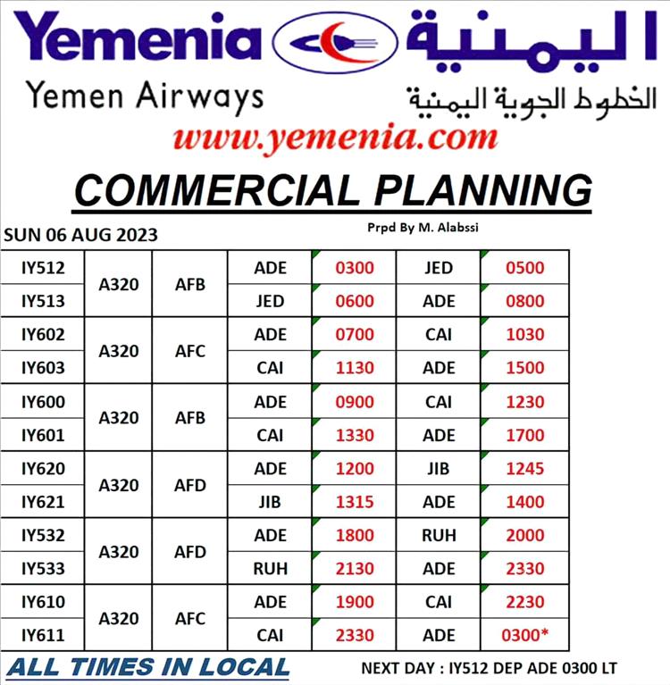جدول مواعيد اقلاع رحلات طيران اليمنية ليوم غد الأحد كالتالي: