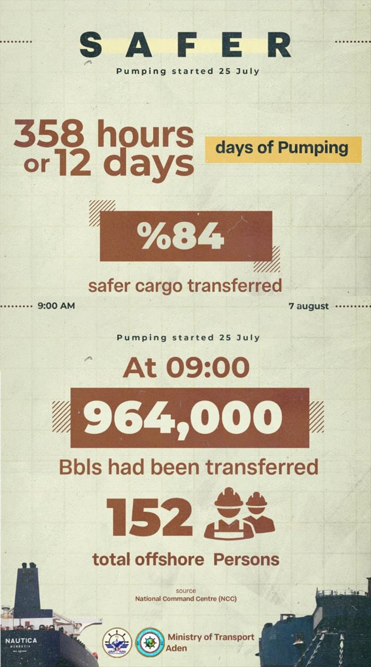واوضحت وزارة النقل في صفحتها الرسمية عن الهيئة العامة للشئون البحرية ، بان اجمالي الكمية التي تم تفريغها حتى يومنا هذا تصل لنحو 84% من اجمالي الكمية الموجودة في خزان صافر ، بينما كان اجمالي عدد الاشخاص المتواجدين اثناء عملية التفريغ نحو 152شخصاً ، بينما وصلت عدد ايام التفريغ حتى يومنا هذا منذ بدء عملية التفريغ نحو 12 يوماً .