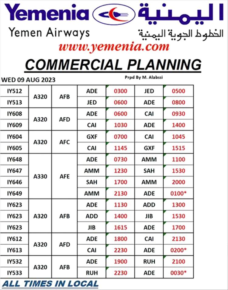 جدول مواعيد اقلاع رحلات طيران اليمنية ليوم غد الاربعاء كاتالي: