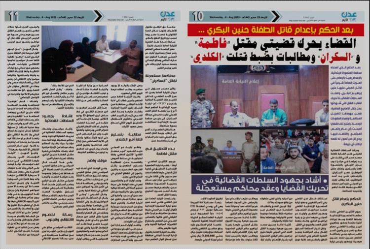 بعد الحكم الذي أصدرته محكمة المنصورة الإبتدائية، بالإعدام رمياً بالرصاص حتى الموت قصاصاً شرعياً في قاتل المجني عليها حنين إبراهيم البكري، واصلت السلطات القضائية تحريك قضايا القتل التي شهدتها عدن خلال الأسابيع الماضية، ضمن جهودها لتعجيل المحاكمة وإصدار العقوبات الرادعة، باعتبار تلك القضايا أصبحت رأي عام وتمس المجتمع، والقضاء فيها يردع كل من تسول له نفسه ارتكاب أي جريمة.