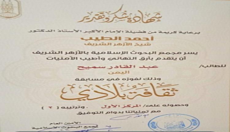 وحاز الطالب عبدالقادر سميح ، من أبناء عدن على شهادة شكر وتقدير في المسابقة التي رعاها فضيلة الإمام الأكبر الاستاذ الدكتور احمد الطيب ، شيخ الأزهر الشريف.
