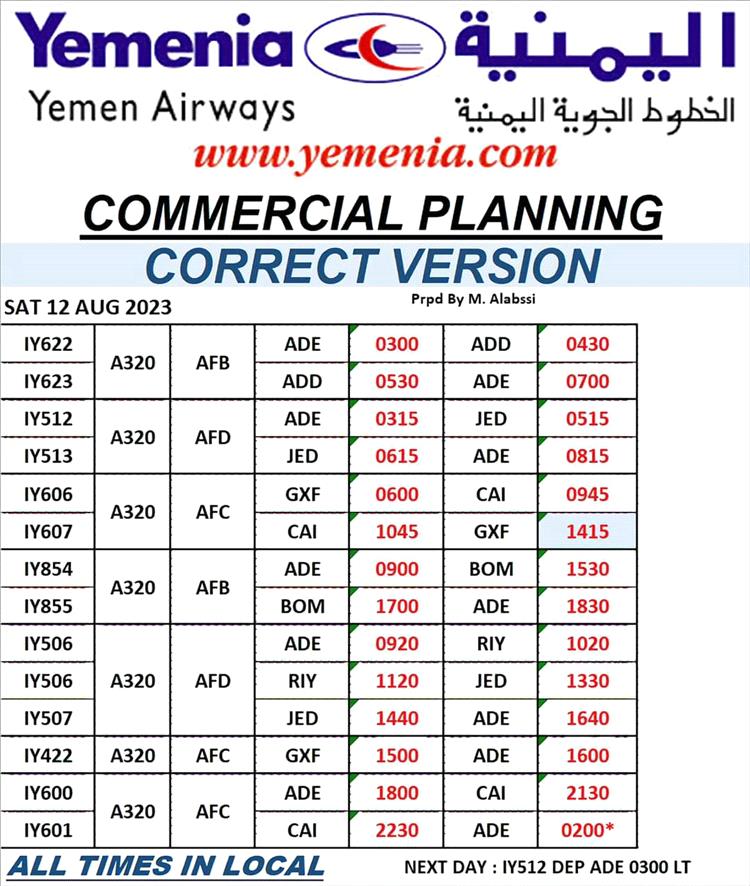 جدول مواعيد اقلاع رحلات طيران اليمنية ليوم غد السبت كالتالي: