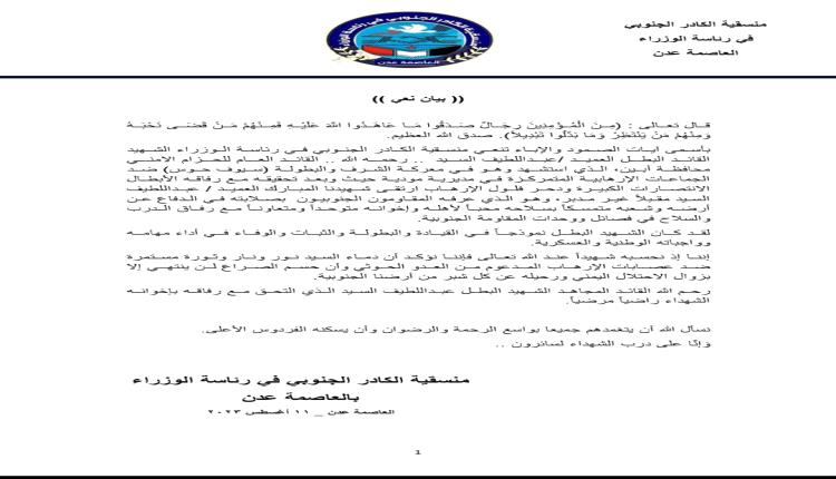 نعت منسقية الكادر الجنوبية في رئاسة الوزراء بالعاصمة عدن في بيان رسمي أستشهاد قائد قوات الحزام الامني في محافظة الذي أستشهد مع عدد من رفاقه في مواجهات عسكرية ضد التنظيمات الارهابية في مديرية مودية محافظة أبين جاء فيه :