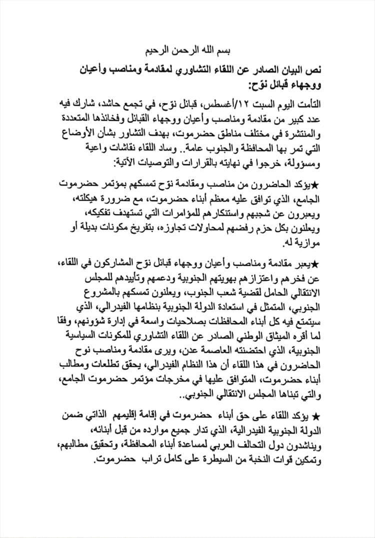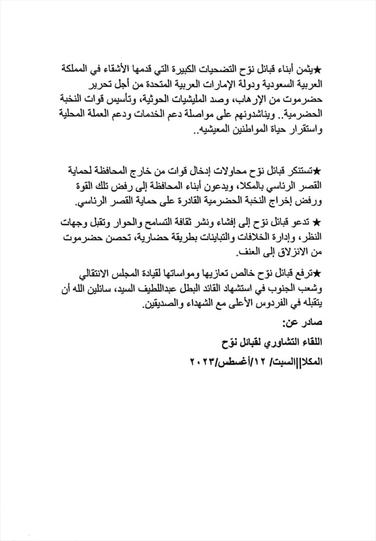 - تستنكر قبائل نوّح محاولات إدخال قوات من خارج المحافظة لحماية القصر الرئاسي بالمكلا، ويدعون أبناء المحافظة إلى رفض تلك القوة ورفض إخراج النخبة الحضرمية القادرة على حماية القصر الرئاسي.