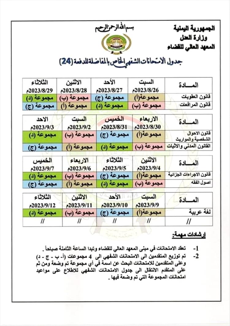 وأقرت اللجنة إقامة الامتحانات الشفهية للمقبولين المزمع انطلاقه في (26) أغسطس الجاري 2023م في مبنى معهد القضاء العالي في مديرية خورمكسر بالإضافة لجدول الامتحانات وقوائم مجموعات المتقدمين وفقا لما توضحه الصور المرفقة.