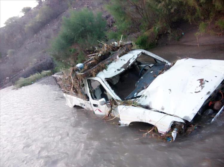 واضافت المصادر إن السيول القادمة من وادي ورزان شرقي محافظة تعز داهمت سائق السيارة مع رفاقه داخل الوادي، لكنهم تمكنوا من النجاة والهرب بانفسهم فيما جرفت السيول السيارة وما تحمله من الماشية.