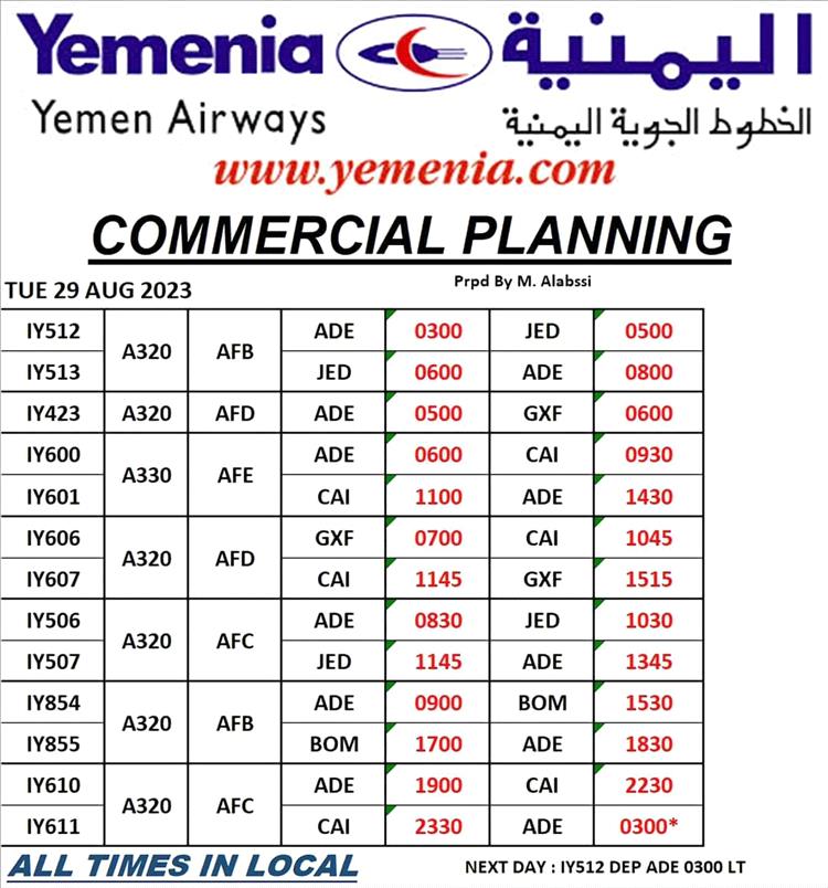 جدول مواعيد اقلاع رحلات طيران اليمنيه ليوم غد الثلاثاء الموافق2023/8/29