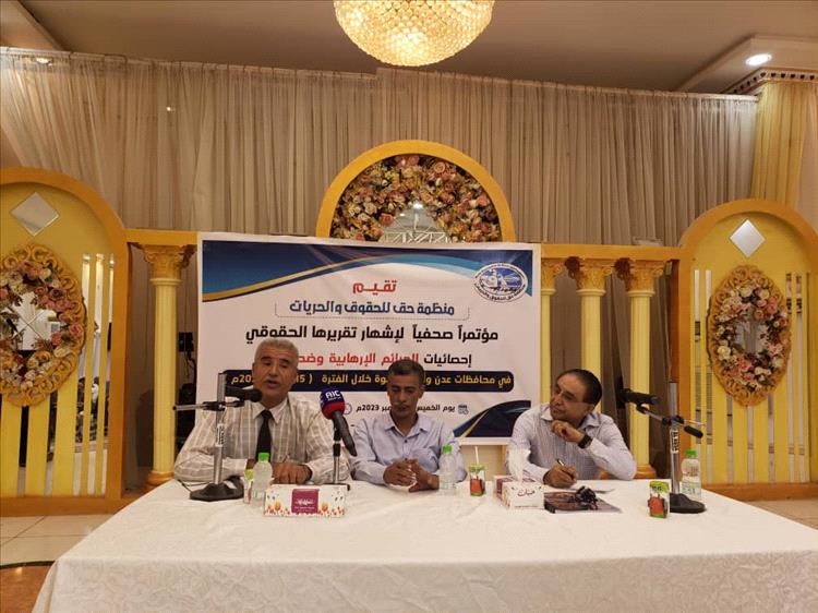 أقامت منظمة حق للحقوق والحريات صباح اليوم الخميس ٧ سبتمير ٢٠٢٣ مؤتمرا صحفيا في قاعة قصر مرسيليا بخور مكسر - عدن لإشهار تقريرها بعنوان : " الحصاد البشع للذئاب المنفلتة : إحصائيات الجرائم الإرهابية وضحاياها في عدن وأبين وشبوة خلال الأعوام ٢٠١٥ _ ٢٠٢٢ ) بحضور ومشاركة جمع من القيادات الجنوبية والصحفيين والإعلاميين ومنظمات المجتمع المدني والباحثين والأكاديميين والنشطاء في مجال حقوق الإنسان والتواصل الاجتماعي وممثلين عن وسائل الإعلام وممثلات لرائدات مجتمعيات وجمع من القيادات والمهتمين بقضايا الشأن العام .