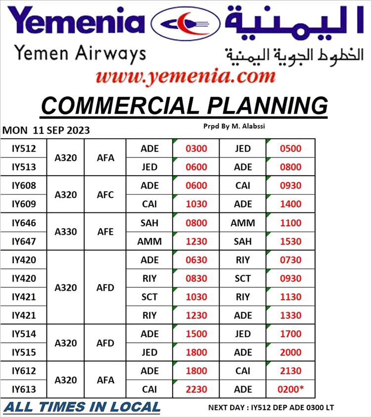 جدول مواعيد اقلاع رحلات طيران اليمنية ليوم غد الاثنين كالتالي: