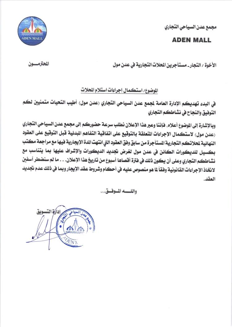 كما طالبت الإدارة من المستاجرين مراجعة مكتب بكسل للديكورات الكائن في عدن مول، وذلك لتجديد الديكورات والإشراف عليها بما يتناسب مع نشاطهم التجاري، لفترة مدتها اسبوع كحد أقصى، من تاريخ الاعلان المحرر اليوم الاثنين.