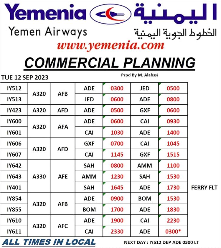 جدول مواعيد اقلاع رحلات طيران اليمنيه ليوم غد الثلاثاء الموافق2023/9/11