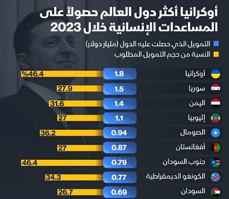 وتلقت أوكرانيا إعانات بقيمة 1.8 مليار دولار منذ بداية العام الجاري، لتكون أكثر البلدان حصولاً على المساعدات الإنسانية، يليها سوريا وثم #اليمن في المرتبة الثالثة على مستوى العالم باعانات تصل 1.4 مليار دولار.