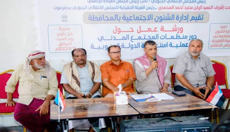 برعاية كريمة من الرئيس القائد عيدروس بن قاسم الزبيدي رئيس المجلس الانتقالي الجنوبي، وتحت إشراف رئيس الهيئة التنفيذية للمجلس بمحافظة حضرموت، نفذت الإدارة الاجتماعية بالهيئة، بمدينة غيل باوزير، صباح اليوم السبت، ورشة عمل عن دور منظمات المجتمع المدني في استعادة الدولة الجنوبية.