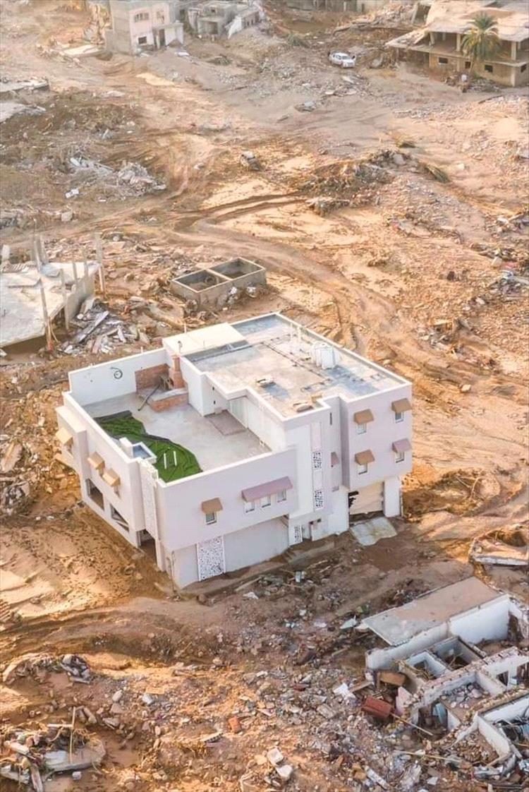 تداول رواد مواقع السوشل ميديا مجموعة صور ومقاطع فيديو لمنزل بقي صامداً وسط مدينة درنة الليبية، رغم الفيضانات التي اجتاحت المدينة منذ أيام ودمرتها تماماً، مخلفة آلاف القتلى والمفقودين والمشردين.