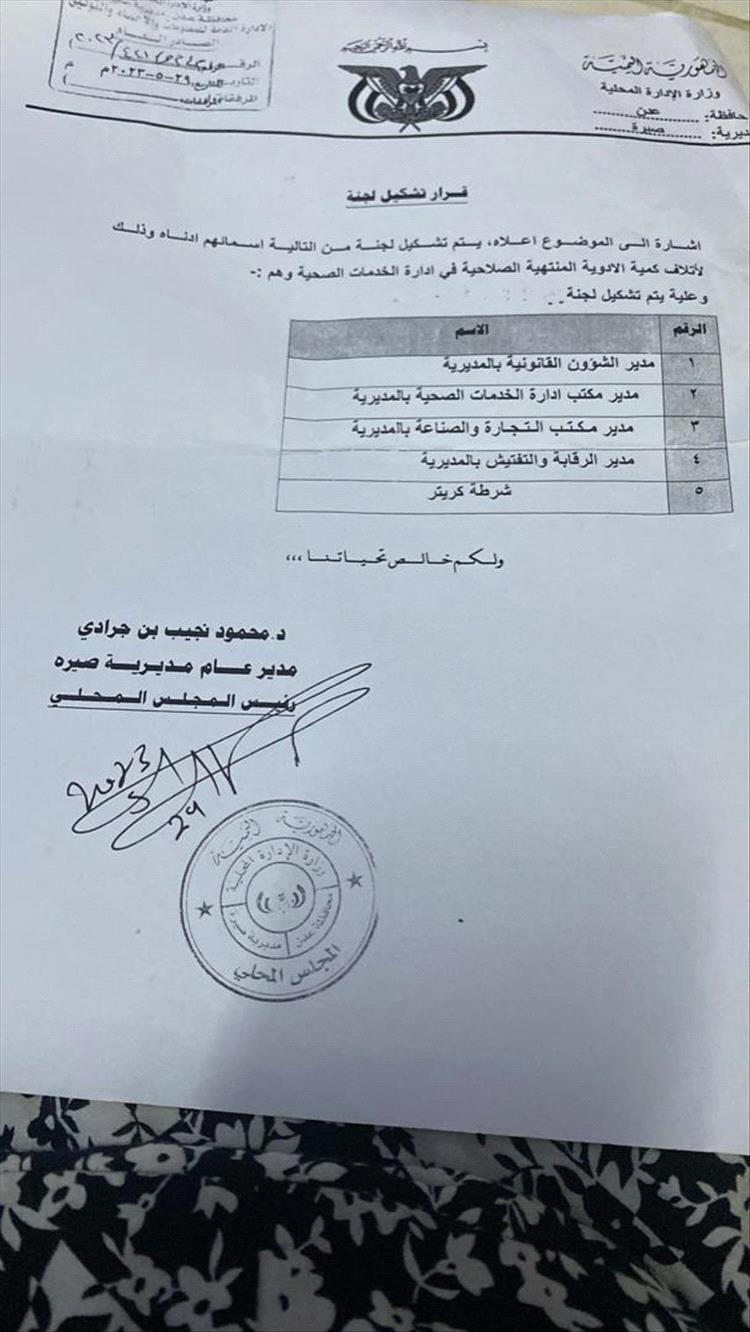 3 ــ تم تشكيل لجنة من قبل مدير عام مديرية صيرة، الدكتور محمود بن جرادي، من المختصين في قسم شؤون الصيدليات ومكتب الصحه والسكان بالعاصمة عدن ومديرية صيرة (حسب التوجيه المرفق)