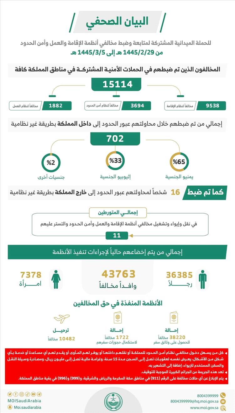 قالت وزارة الداخلية بالمملكة العربية السعودية السبت ان خلال أسبوع تم ضبط 15114 مخالفًا لأنظمة الإقامة والعمل وأمن الحدود.