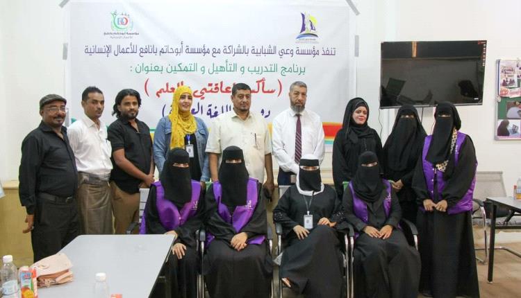دشنت مؤسسة وعي الشبابية بالشراكة مع مؤسسة ابوحاتم بانافع للأعمال الإنسانية برنامج التدريب والتأهيل و التمكين بعنوان "سأكسر اعاقتي بالعلم" لرفع مستوى التنمية لفتيات الصم"ذوي الاحتياجات الخاصة بالعاصمة عدن "من أجل سهولة دمجهم بالمجتمع وتطوير حياتهم واكتساب المهارات الحياتية.