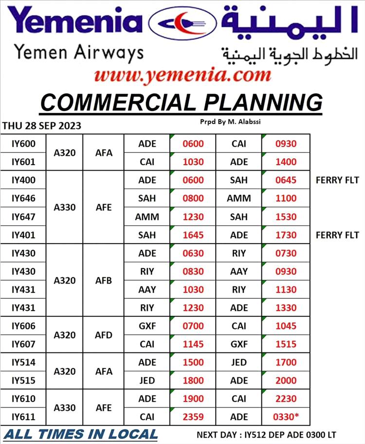 جدول مواعيد اقلاع رحلات طيران اليمنية ليوم غد الخميس