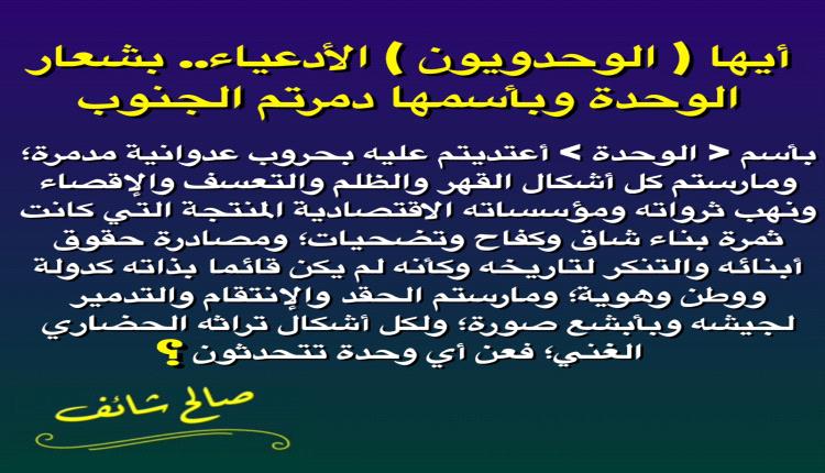 خاطب الكاتب السياسي الجنوبي صالح شائف ( الوحدويون ) الأدعياء بشعار الوحدة وبأسمها دمرا الجنوب.
