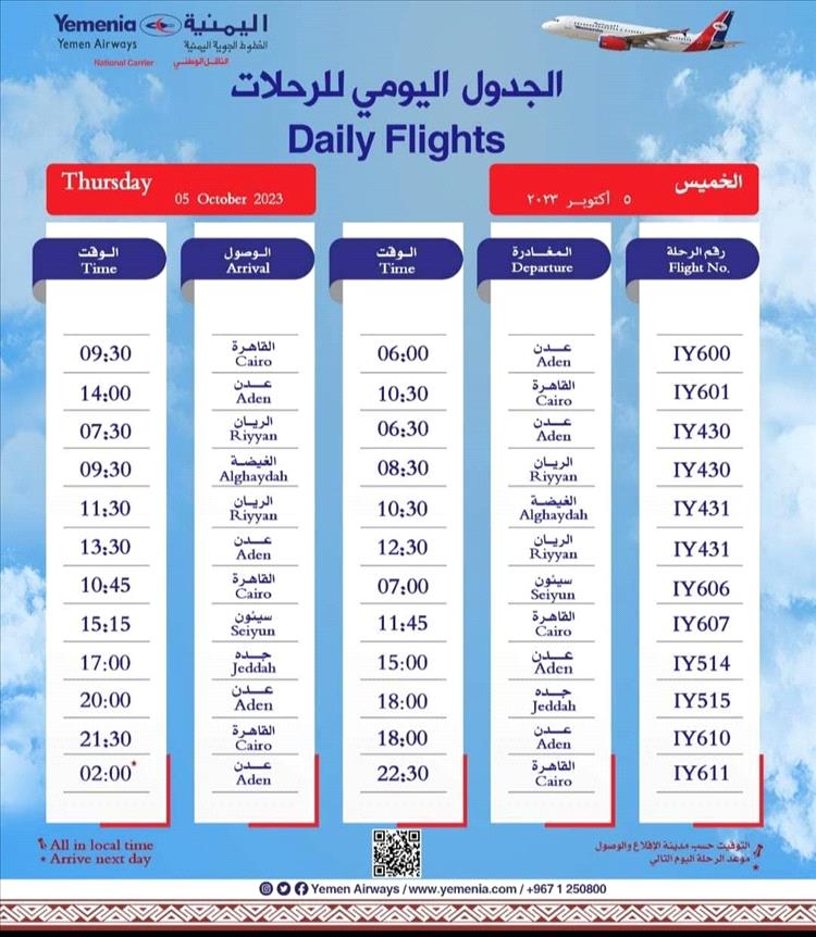 جدول مواعيد اقلاع رحلات طيران اليمنيه ليوم غد الخميس