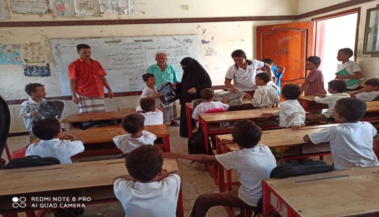 تواصل توزيع الحقائب المدرسية لطلاب المدرسه بالحوطة لحج