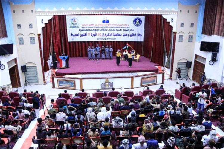نظمت الهيئة التنفيذية القيادة المحلية للمجلس الانتقالي الجنوبي بمحافظة شبوة، مساء أمس السبت، حفلاً خطابياً وفنياً احتفاءً بالذكرى الـ60 لثورة 14 أكتوبر المجيدة، برعاية كريمة من الرئيس القائد عيدروس قاسم الزُبيدي، رئيس المجلس الانتقالي، تحت شعار" الجنوب بكل ولكل أبنائه".
