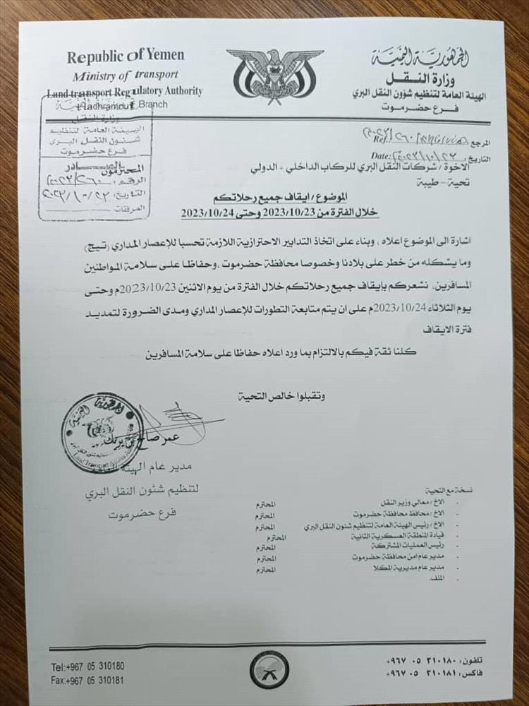 هيئة النقل البري بحضرموت تبلغ جميع الشركات بتوقيف الرحلات