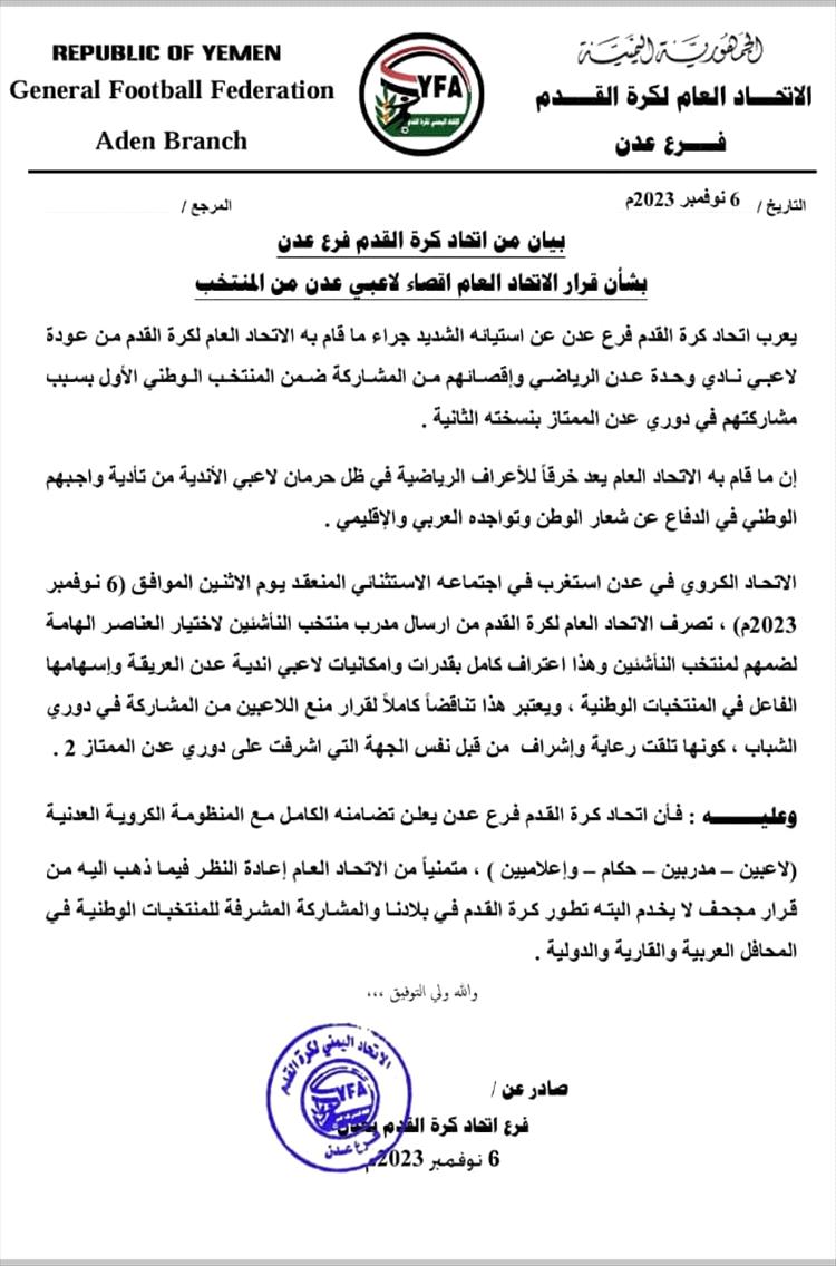 الاتحاد الكروي في عدن استغرب في اجتماعه الاستثنائي المنعقد يوم الاثنين الموافق (6 نوفمبر 2023م) , تصرف الاتحاد العام لكرة القدم من ارسال مدرب منتخب النأشئين لاختيار العناصر الهامة لضمهم لمنتخب النأشئين وهذا اعتراف كامل بقدرات وامكانيات لاعبي اندية عدن العريقة وإسهامها الفاعل في المنتخبات الوطنية , ويعتبر هذا تناقضاً كاملاً لقرار منع اللاعبين من المشاركة في دوري الشباب , كونها تلقت رعاية وإشراف من قبل نفس الجهة التي اشرفت على دوري عدن الممتاز 2 .