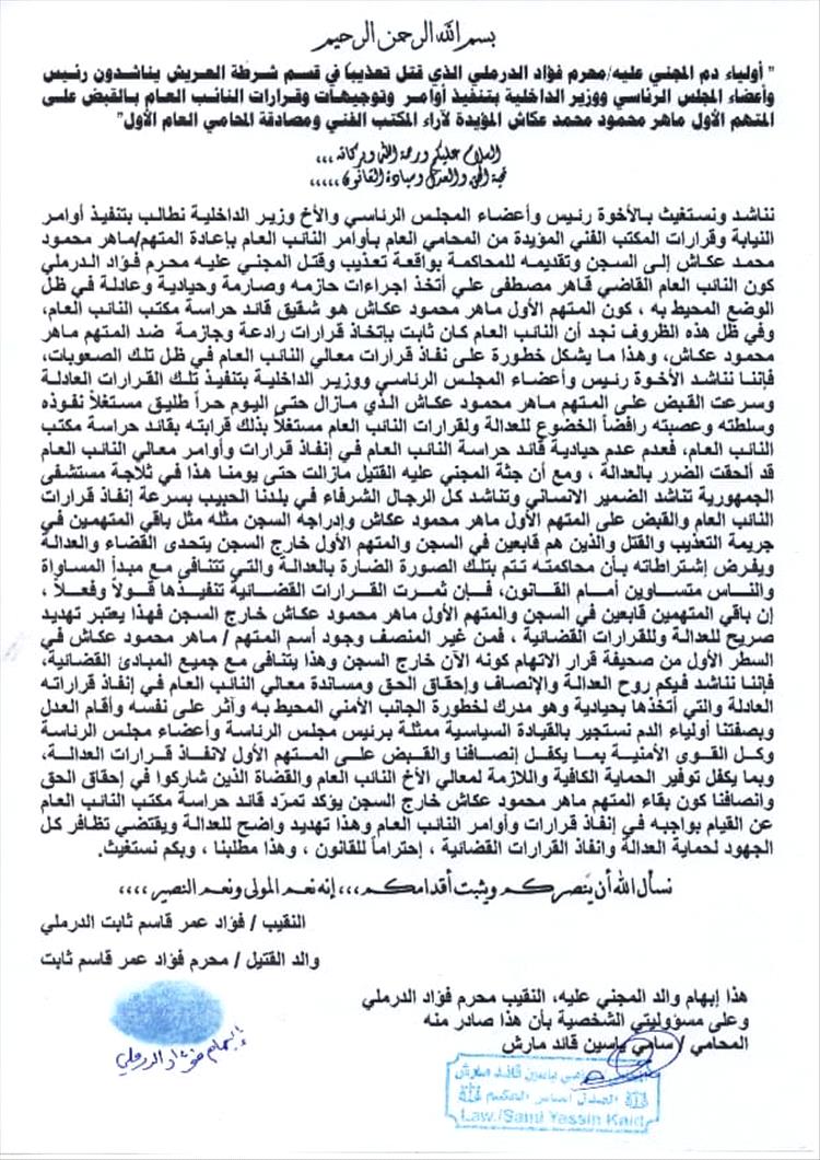 وأوضح "إننا نناشد فيكم روح العدالة والإنصاف وإحقاق الحق ومساندة معالي النائب العام في إنفاذ قراراته العادلة والتي أتخذها بحيادية وهو مدرك لخطورة الجانب الأمني المحيط به وآثر على نفسه وأقام العدل وبصفتنا أولياء الدم نستجير بالقيادة السياسية ممثلة برئيس مجلس الرئاسة وأعضاء مجلس الرئاسة وكل القوى الأمنية بما يكفل إنصافنا والقبض على المتهم الأول لانفاذ قرارات العدالة، وبما يكفل توفير الحماية الكافية واللازمة لمعالي الأخ النائب العام والقضاة الذين شاركوا في إحقاق الحق وانصافنا،كون بقاء المتهم ماهر محمود عكاش خارج السجن يؤكد تمرّد قائد حراسة مكتب النائب العام عن القيام بواجبه في إنفاذ قرارات وأوامر النائب العام وهذا تهديد واضح للعدالة ويقتضي تظافر كل الجهود لحماية العدالة وانفاذ القرارات القضائية ، إحتراماً للقانون ، وهذا مطلبنا ، وبكم نستغيث".