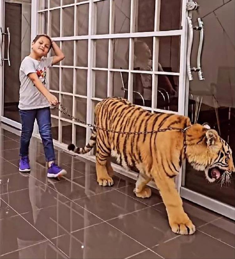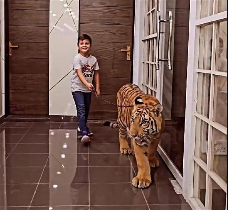 صور - طفل يذهل الجميع بظهوره يقود نمر كحيوانه الأليف