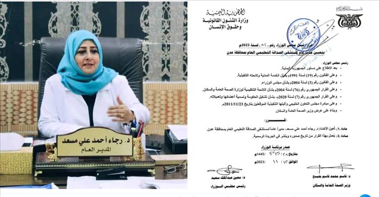 - مادة (1) تعين الأخت .د. رجاء أحمد علي مسعد مديراً عاماً لمستشفى الصداقة التعليمي العام بمحافظة عدن.