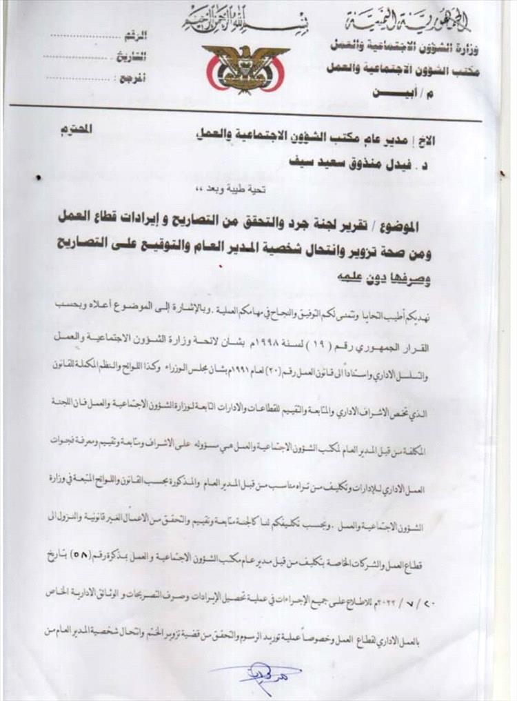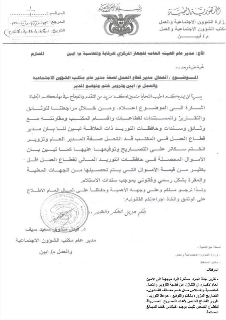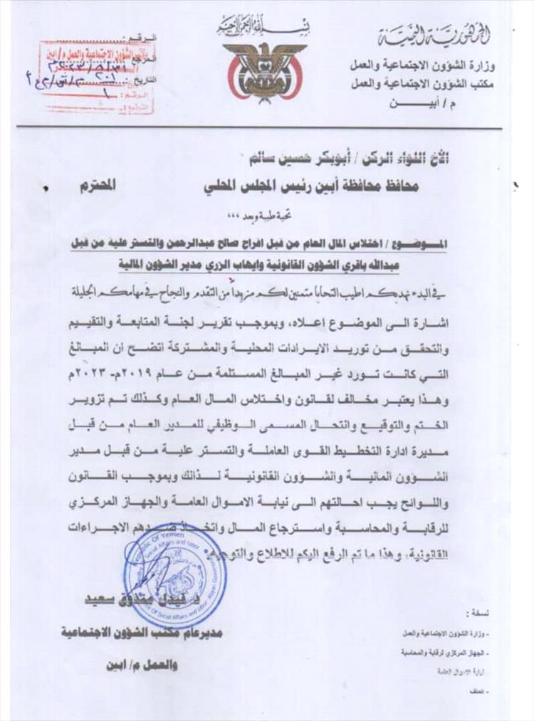 وأضاف مدير عام مكتب الشؤون الاجتماعية والعمل بأبين أنه بموجب تقرير لجنة المتابعة والتقييم والتحقق من توريد الإيرادات المحلية والمشتركة اتضح إن المبالغ التي كانت تورد غير المبالغ المستلمة من عام 2019م- 2023م والذي يعتبر مخالف لقانون واختلاس المال العام،لاسيما تزوير الختم والتوقيع وانتحال المسمى الوظيفي للمدير العام من قبل مديرة إدارة التخطيط القوى العاملة والتستر عليه من قبل مدير الشؤون المالية والشؤون القانونية.