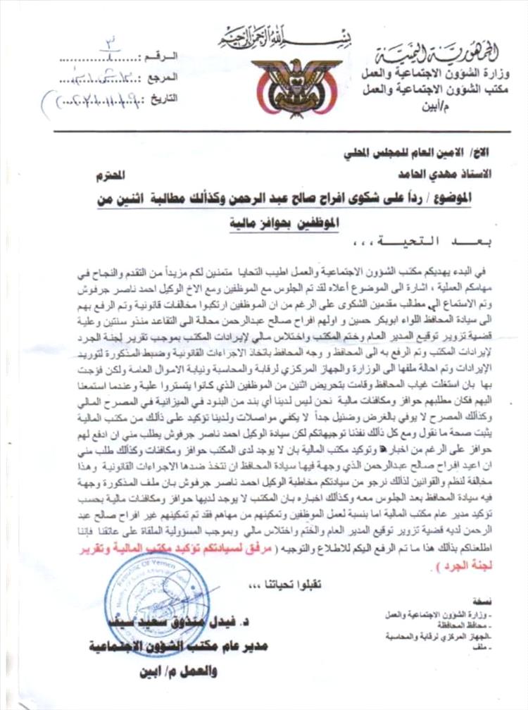وأكد منذوق اختلاس المال العام وانتحال المسمى الوظيفي من قبل افراح صالح عبدالرحمن والتستر عليها من قبل مدير الشؤون القانونية ومدير الشؤون المالية أدى إلى قيام سلطة أبين بتهديده وتكليف شخص بدلا عنه نتيجة عدم تنفيذ توجيهاتهم في فسادهم المالي في قطاع العمل الخاص.