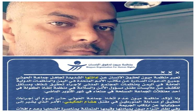 وإذ تؤكد منظمة ميون عدم اتخاذ جماعة الحوثي حتى اليوم أي إجراءات تحقيق أو مساءلة المتورطين في مقتل الحكيمي، الأمر الذي يشير إلى مسؤوليتها عن ارتكاب الجريمة.