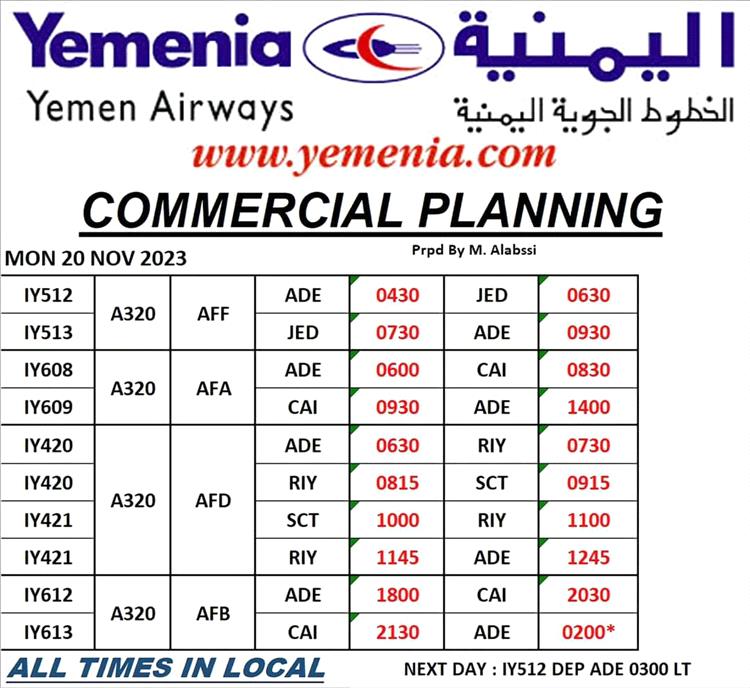 جدول مواعيد اقلاع رحلات طيران اليمنية ليوم غد الاثنين كالتالي: