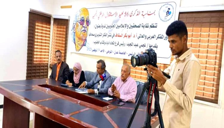 وفي الندوة التي انعقدت بمقر النقابة بالتواهي بمناسبة العيد 56 للاستقلال الوطني المجيد 30 نوفمبر بعنوان :" دور المفكر العالمي أ.د. أبوبكر السقاف في نشر الفكر التنويري صحافيا" قدم خلالها الكاتب والمؤرخ نجمي عبدالمجيد ، ورقة استعرض خلالها محاور أربعة في سيرة ونضال وفكر السقاف التنويري صحافيا ونماذج من كتابات جمة تعرض بسببها لمضايقات وضغوطات والاذى بل حد الاعتداء عليه ضربا بالعصى الكهربائية والفصل من جامعة صنعاء.