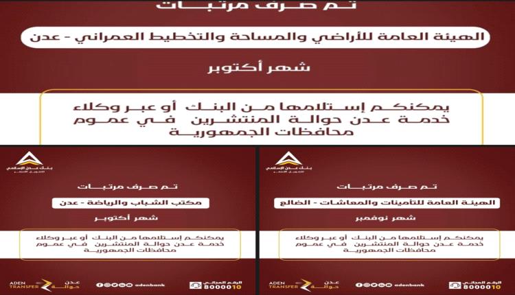 بنك عدن يواصل صرف مرتبات أكتوبر لعدد من المرافق الحكومية