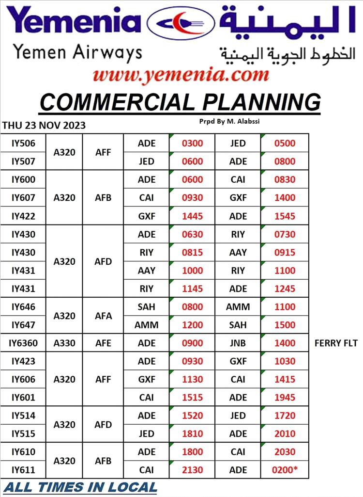 مواعيد اقلاع رحلات طيران اليمنية ليوم غد الخميس كالتالي: