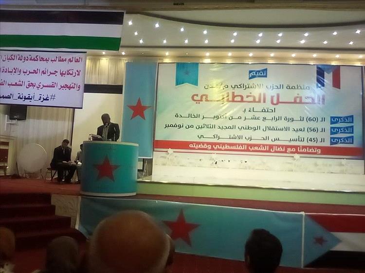 وعبر عن شكره الجزيل للحزب الاشتراكي على تنظيم هذا الحفل لإحياء هذه المناسبات الوطنية الغالية. وبعد ذلك جاء دور كلمة الشعب الفلسطيني التي ألقاها (د. محمد أبو رجب) مدير مكتب الجبهة الشعبية لتحرير فلسطين أكد فيها استمرار مقاومة الشعب الفلسطيني بكل بسالة وأنها عصية على الانكسار، وقد أذاقت جيش الكيان الصهيوني مرارة الهزيمة في غزة الصامدة، وما هذه الجولة إلا بداية النصر لفلسطين ومقاومتها على طريق التحرير لكل فلسطين.