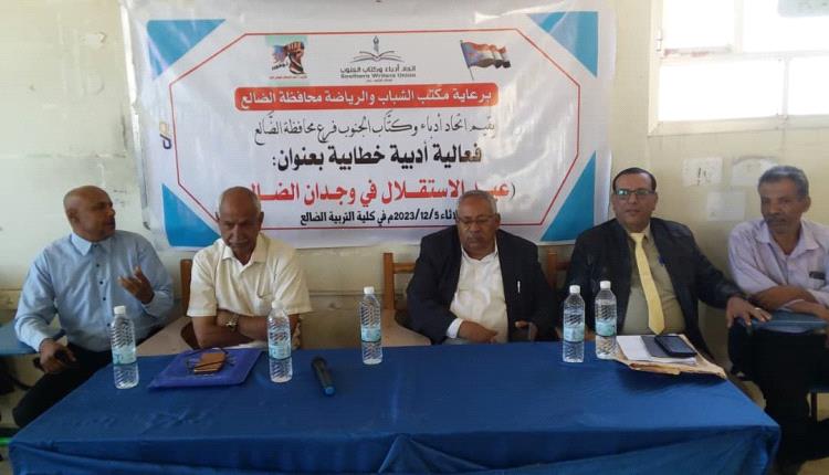 أقام اتحاد أدباء وكتاب الجنوب فرع محافظة الضالع اليوم الثلاثاء الموافق 2023/12/5 فعالية أدبية خطابية، بمناسبة الذكرى ال56 للعيد لاستقلال الوطني 30 نوفمبر المجيد.