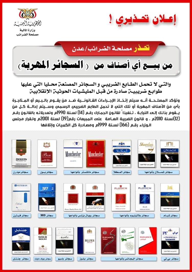كما نشرت مصلحة الضرائب في العاصمة عدن، صورًا توضح فيها أسماء وأنواع السجائر المهربة التي لا تحمل الطابع الضريبي القانوني، والتي تعتبر القانونية، وغير الشرعية. الصور توضح أسماء وأنواع السجائر المهربة: