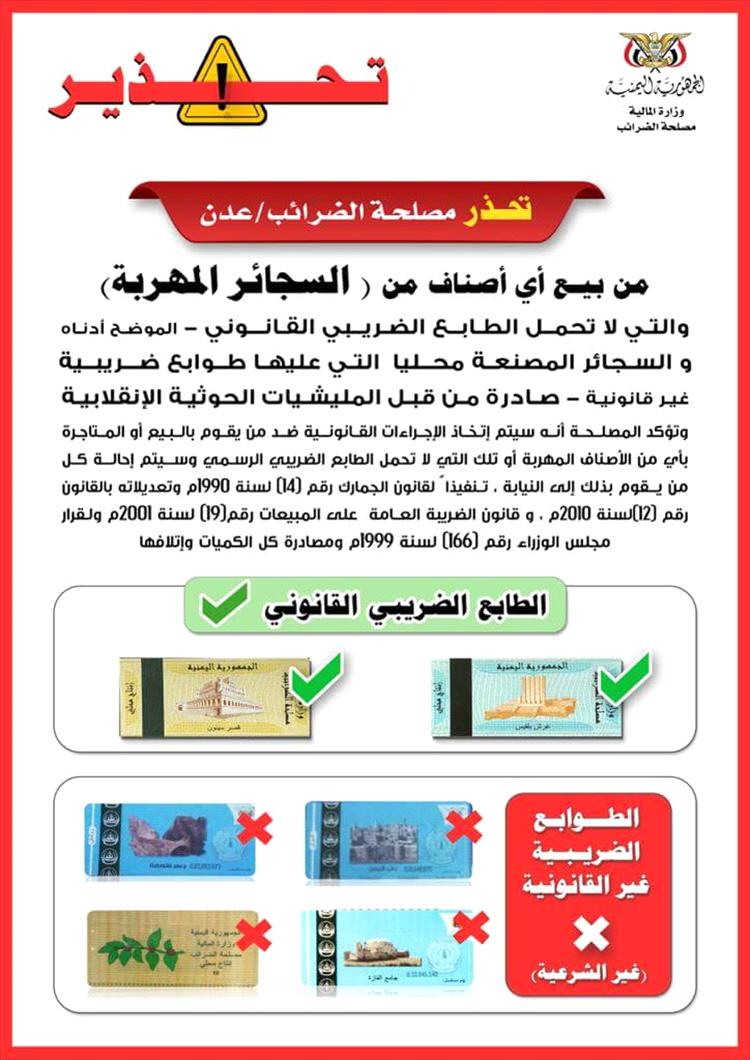 وقالت مصلحة ضرائب العاصمة عدن، في تحذيرها الرسمي “تحذرت مصلحة الضرائب في العاصمة عدن من بيع أي أصناف من (السجائر المهربة)، والتي لا تحمل الطابع الضريبي القانوني الموضح أدناه (في الصور المرفقة بالخبر)، والسجائر المصنعة محليًا التي عليها طوابع ضريبية غير قانونية، والصادرة من قبل ميليشيا الحوثي الإنقلابية”.