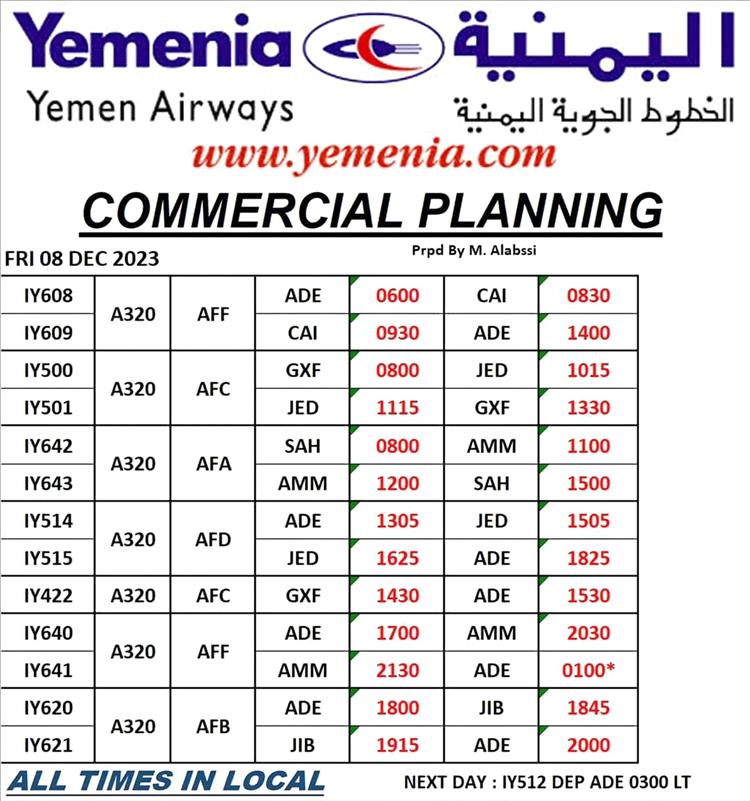 جدول مواعيد اقلاع رحلات طيران اليمنية ليوم غد الجمعة كالتالي: