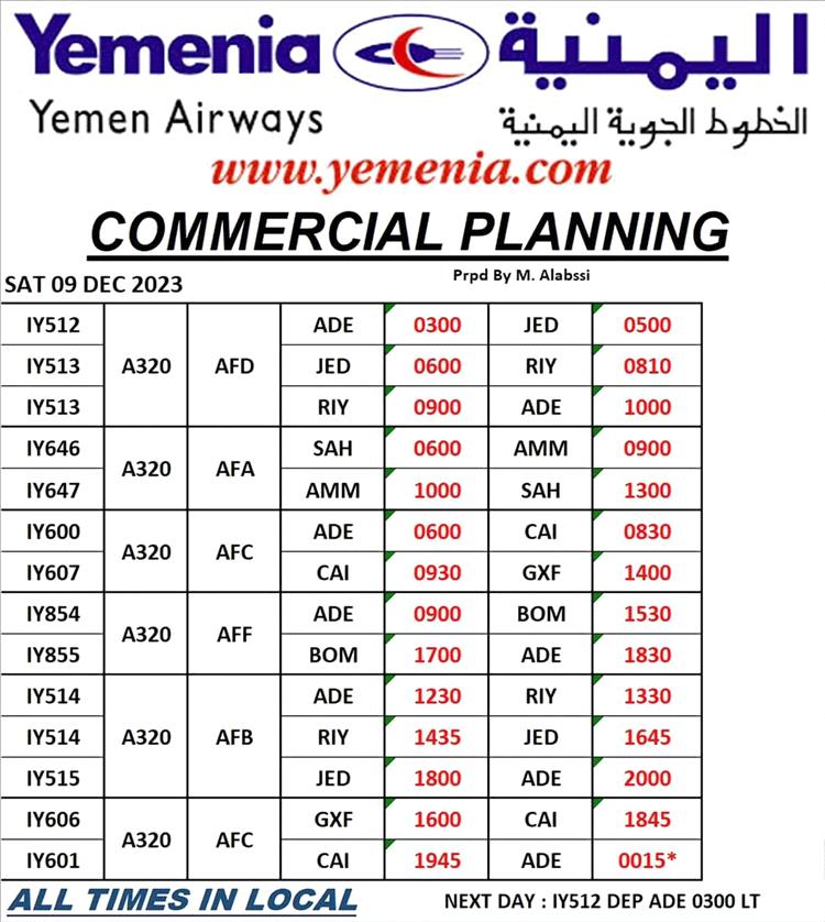 جدول مواعيد اقلاع رحلات طيران اليمنية ليوم غد السبت كالتالي:
