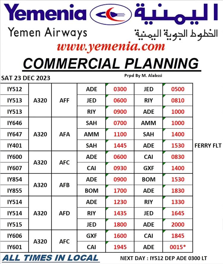 جدول مواعيد اقلاع رحلات طيران اليمنية ليوم غد السبت كالتالي: