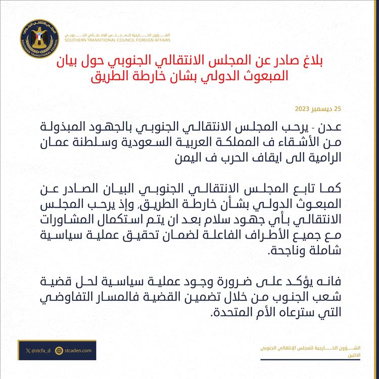 كما تابع المجلس الانتقالي الجنوبي البيان الصادر عن المبعوث الدولي بشأن خارطة الطريق، وإذ يرحب المجلس الانتقالي بأي جهود سلام بعد ان يتم استكمال المشاورات مع جميع الأطراف الفاعلة لضمان تحقيق عملية سياسية شاملة وناجحة.